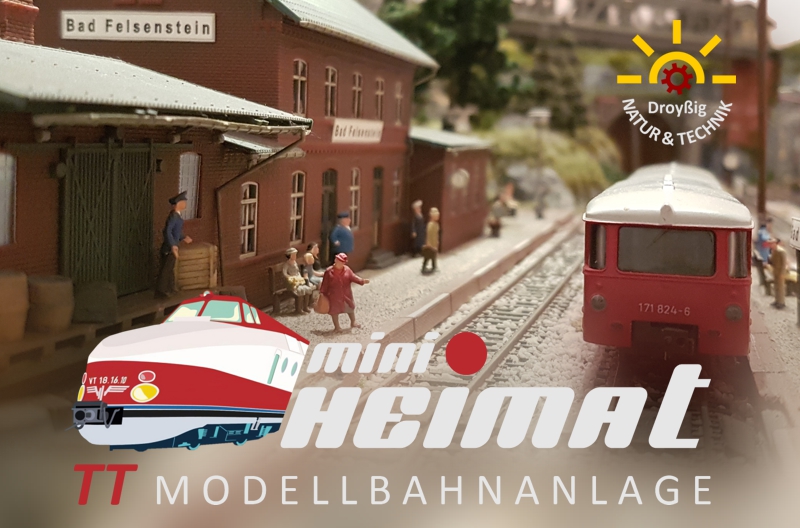 In Droyßig, im Umfeld der im neuen Glanz erstrahlenden Villa Hierschel, lebt Droyßigs lange Bahngeschichte weiter. Die Gleise sind zwar etwas kleiner, dafür ist der Enthusiasmus der "Freizeit-Eisenbahner" um so größer. 2 Bahn-Projekte entstehen hier. Eines davon ist die große Modellbahnanlage - "Mini-Heimat - im Maßstab 1:120 TT.